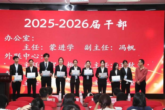 在冉君老师宣布新任主席团成员及各职能中心干部名单后,姚松老师为新任主席团成员郭子谦、郭欣然、王婷、庄雅洁同学,以及各职能中心新任干部蒙进学、贺柳、张超、陆桂丽、邓洁、张长生等同学颁发聘书。