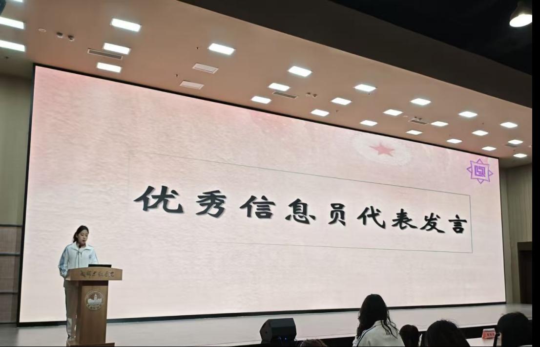 表彰环节结束后,大会进入第三项议程。优秀信息员代表陈欣妍同学上台发言,全场立即响起热烈而持久的掌声,向这位在岗位上履职尽责、表现突出的优秀代表致以敬意。登台后,陈欣妍同学结合自身一学期以来的信息员工作经历,娓娓道来自己的工作感悟与实践心得,既分享了日常走访同学、收集教学反馈、整理上报信息的具体做法,也深刻阐述了对信息员这一岗位的理解——既是师生之间的连心桥,也是教学优化的观察员,更是学风建设的宣传员。