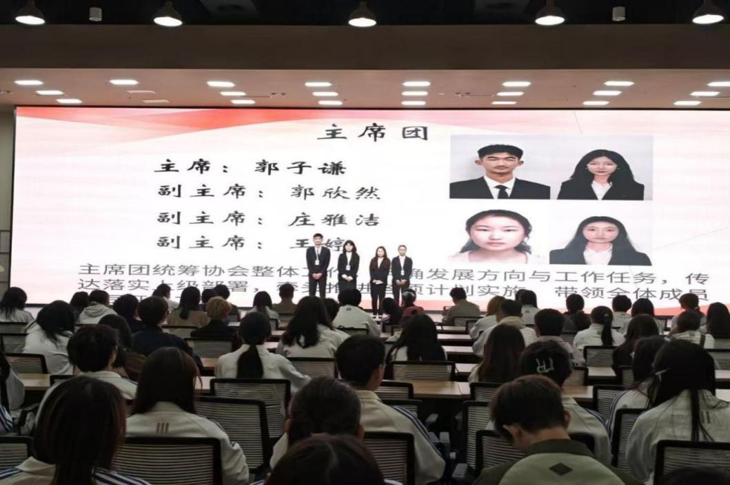 首先亮相的是协会主席团,由郭子谦担任主席,王婷、庄雅洁、郭欣然担任副主席。主席团全面统筹协会整体发展规划,明确核心工作方向,传达落实上级工作部署,牵头推进各项重点任务落地,引领全体成员履职尽责、协同开展工作。