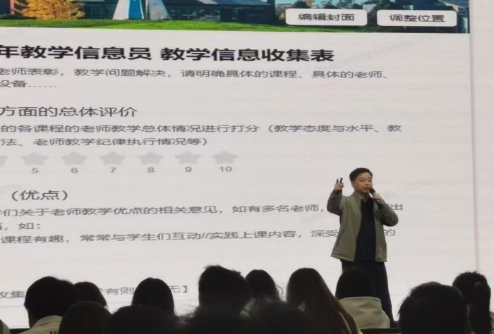 随后,大会进入第四项议程——冉君老师发言。冉君老师全面回顾了本年度教学信息员工作的开展情况,从信息收集质量、反馈响应效率、学风建设贡献等维度,系统总结了过去一学期全体信息员的辛勤付出与显著成效,同时也为下一阶段的工作作出部署,内容细致全面,既饱含对全体信息员的肯定,更寄托着殷切期许,为后续工作指明了清晰路径,赢得了现场师生的广泛认同与热烈掌声。